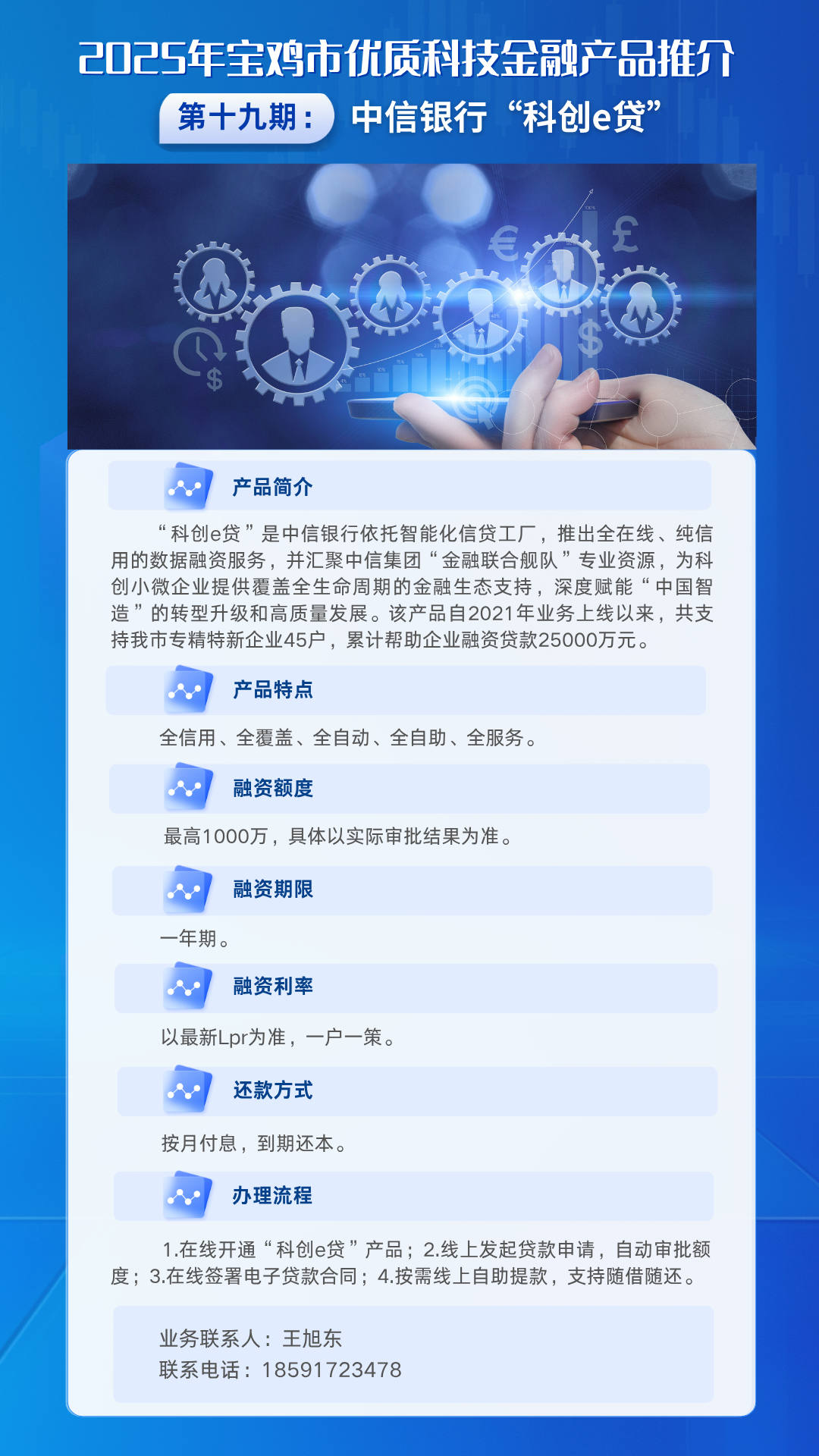 为进一步推动科技与金融深度融合,健全金融支持科技创新体系,深化政银企协同机制,精准对接科技型企业融资需求,宝鸡市科技局特别策划推出优质科技金融产品专题系列。本系列精选金融机构特色产品,旨在为各类科技创新主体提供金融信息参考,促进金融资源与市场主体需求高效匹配。后续将陆续推送系列产品介绍,详细列明各产品特点及申请要求,敬请持续关注。