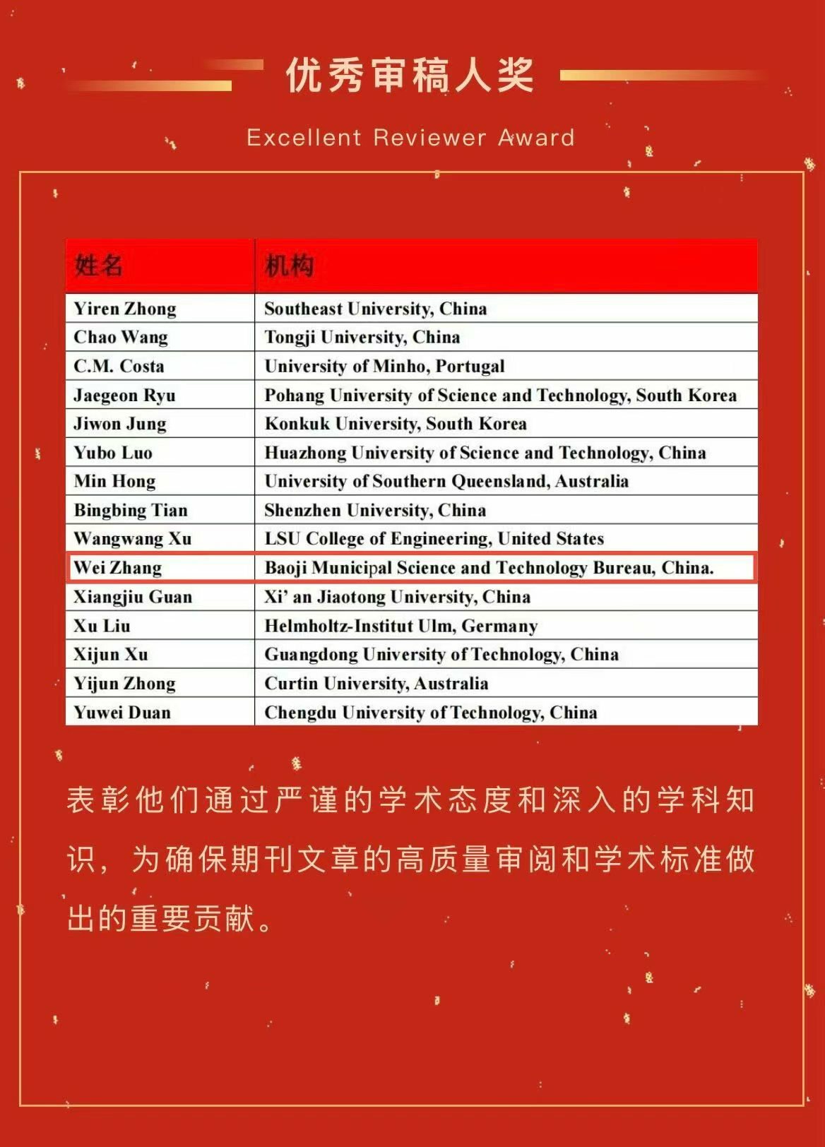 近日,国际知名学术期刊《能源材料》(《Energy Materials》)正式揭晓2025年度“优秀审稿人奖”获奖名单,宝鸡市科学技术局张炜博士,凭借其深厚的学术造诣、严谨的审稿态度及对学科前沿的精准把握,从全球众多顶尖学者中脱颖而出,光荣上榜!此奖项不仅是张炜博士的学术荣誉,更是我市创新人才工作机制链接国际高端学术资源、赋能本地科技创新的重要标志。